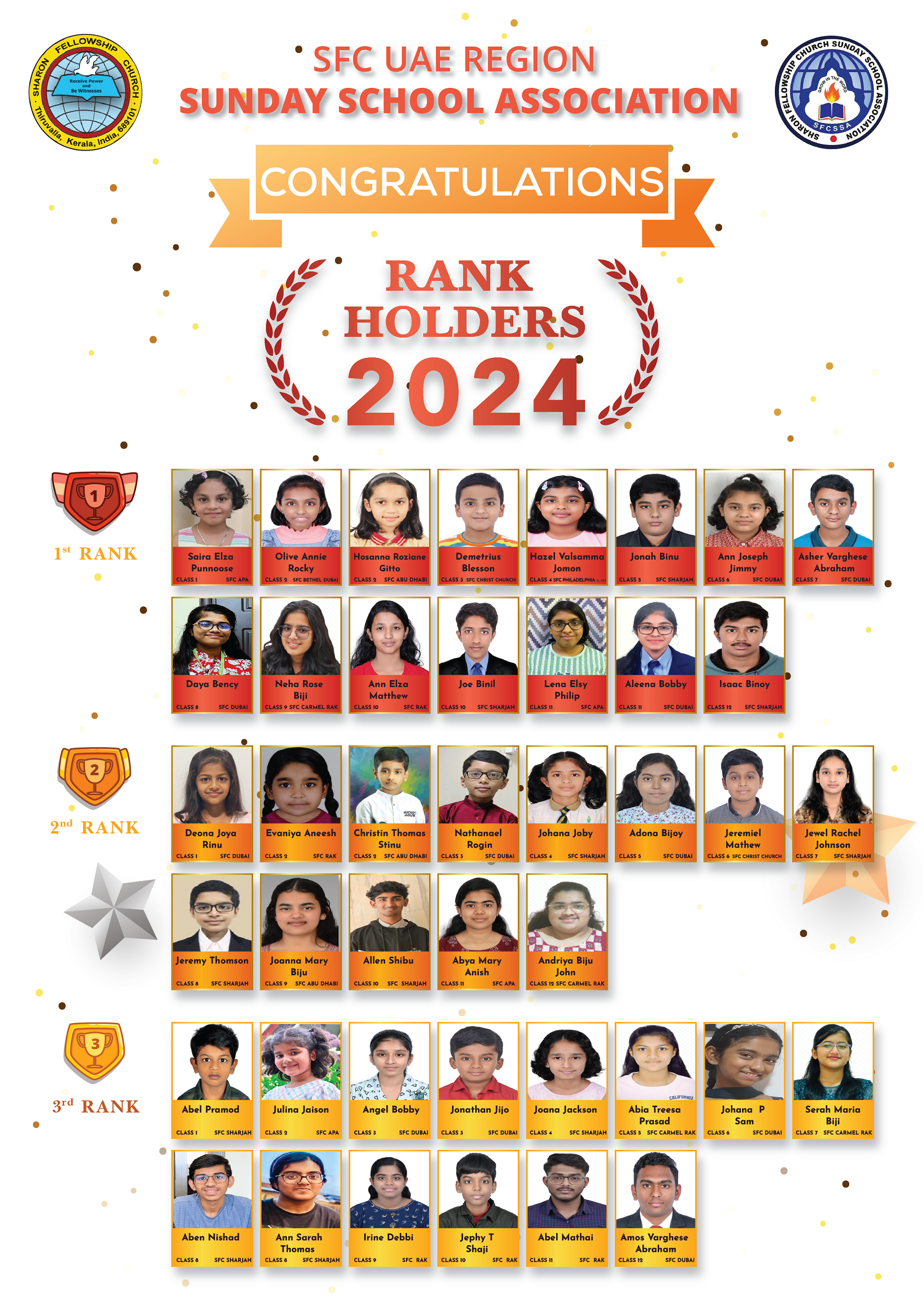 Under the leadership of UAE region, fellowship has a separate Sunday School Executives, comprise of Director Pastor Blesson George, Secretary Br. Blesson Lukose, Exam Controller Br. Aby Mathew, General Coordinator Br. Rocky Sam, Treasurer Br.Jomon Babykutty Committee Member Br. Sam Mathai.At present we have ten Sunday school units. Namely Abudhabi, Al Ain, Dubai, Bethel Dubai, Sharjah, APA, RAK, Satwa Christ Church, Sajja, RAK Carmel.