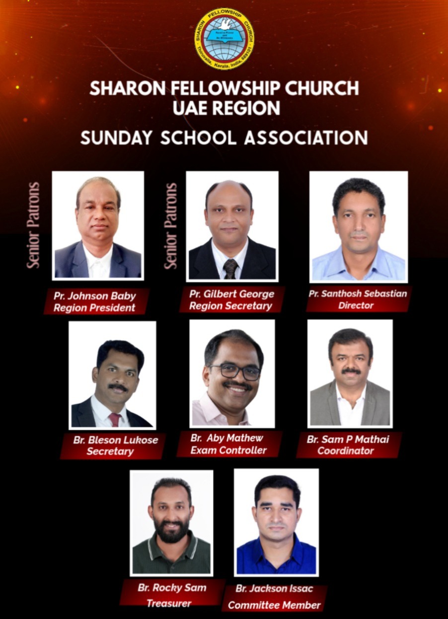 Under the leadership of UAE region, fellowship has a separate Sunday School Executives, comprise of Director Pastor Blesson George, Secretary Br. Blesson Lukose, Exam Controller Br. Aby Mathew, General Coordinator Br. Rocky Sam, Treasurer Br.Jomon Babykutty Committee Member Br. Sam Mathai.At present we have ten Sunday school units. Namely Abudhabi, Al Ain, Dubai, Bethel Dubai, Sharjah, APA, RAK, Satwa Christ Church, Sajja, RAK Carmel.